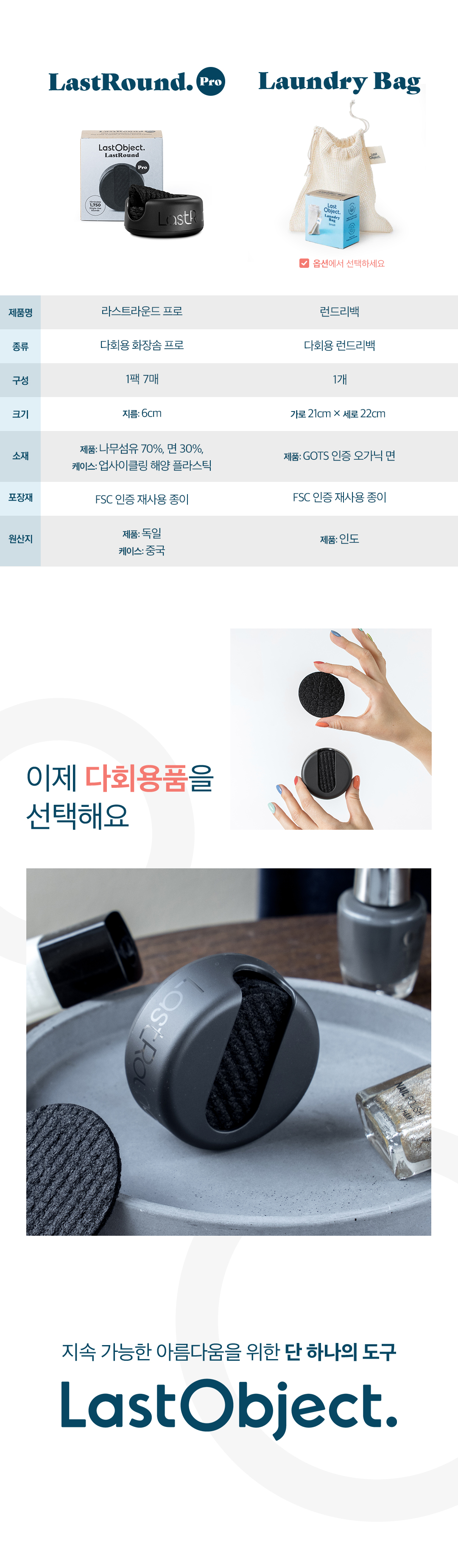 일회용 화장솜 1,750개를 대체할 수 있는 다회용 화장솜 라스트라운드는 해양 플라스틱으로 만들어진 케이스 안에 천연 소재로 만들어진 화장솜 7장이 들어 있습니다. 사용 후 메이크업 리무버로 간편하게 세척하여 잘 말린 후, 케이스에 넣어 위생적으로 보관하세요.